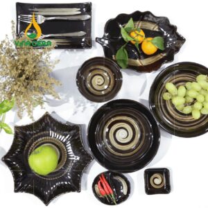 Bộ Chén Đĩa Men Nâu Quét men đen, nâu vẽ hoa văn xoắn ốc vàng. Phù hợp để sử dụng từ những bữa tiệc sang trọng đến những bữa ăn gia đình hàng ngày.