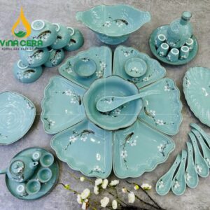 Bộ bàn ăn Vina Cera được làm từ chất đất cao cấp, trên nền men xanh ngọc vô cùng đẹp mắt tạo cảm giác thư giãn, dễ chịu. Bộ sản phẩm được vẽ hoa đào trắng sang trọng và hiện đại.